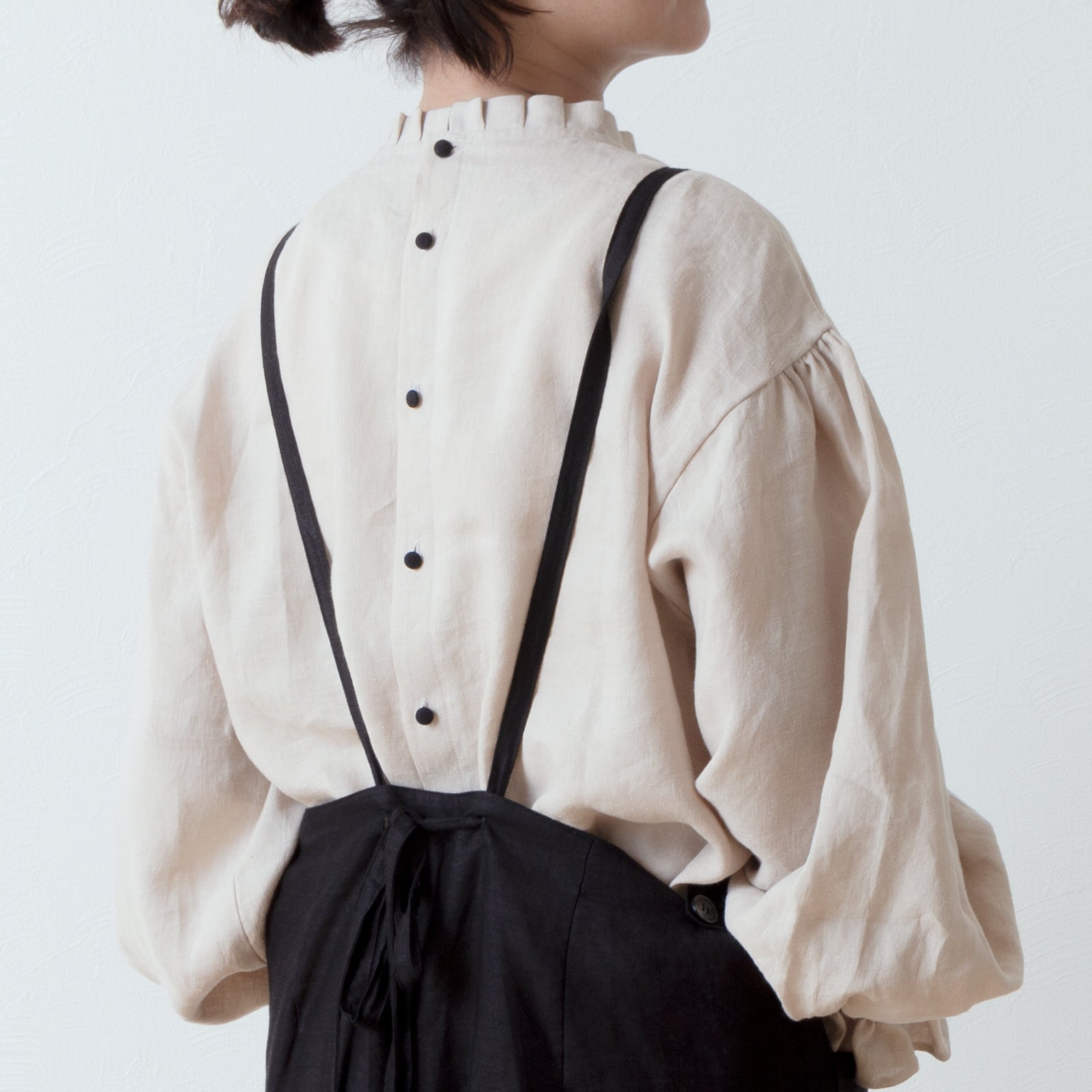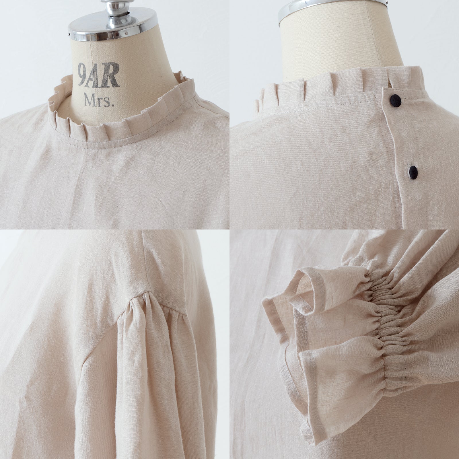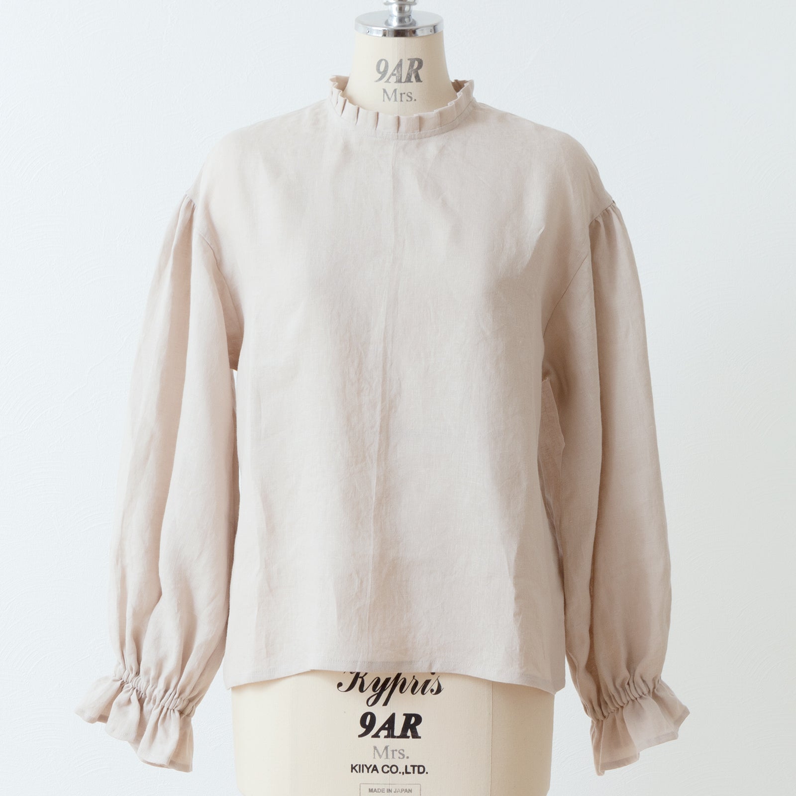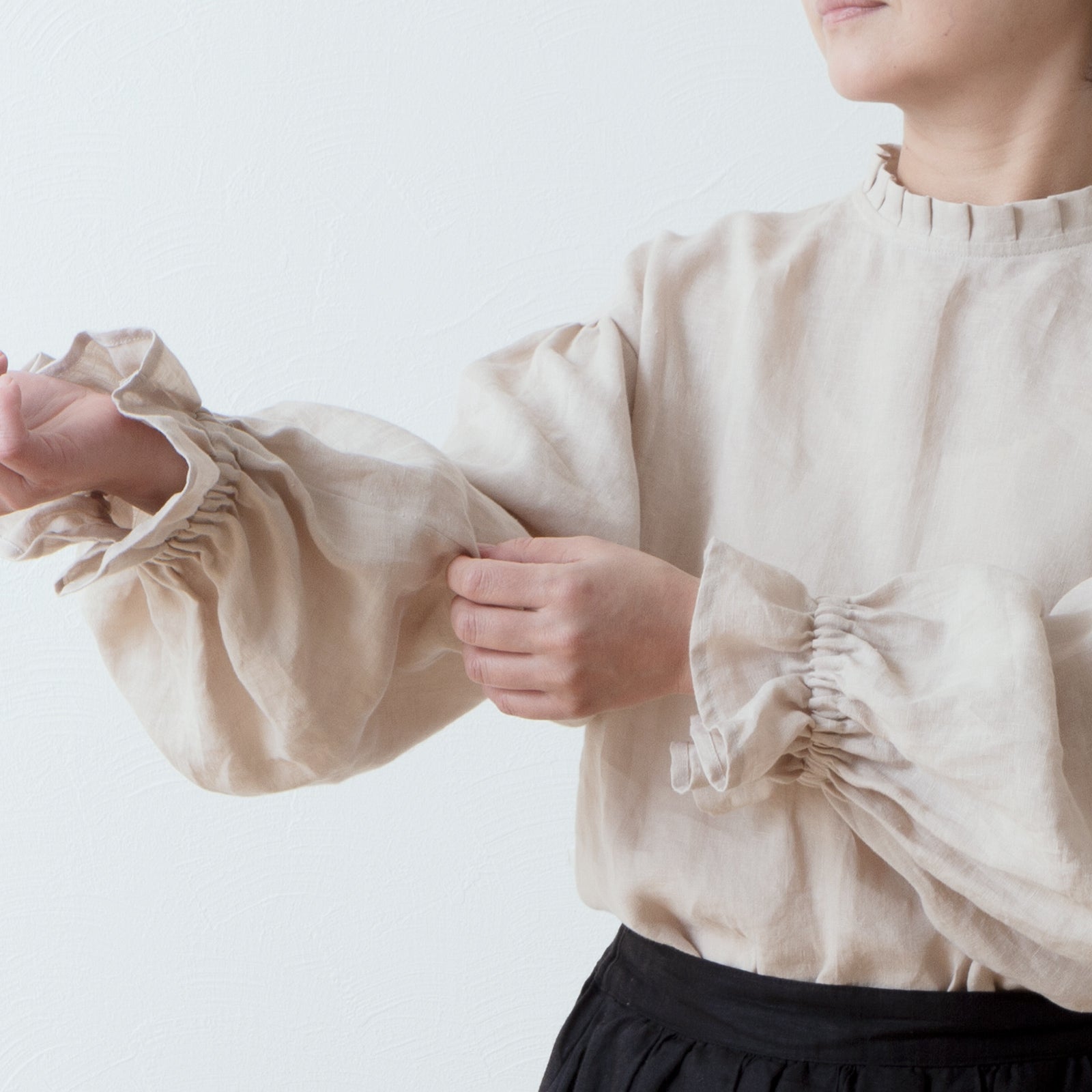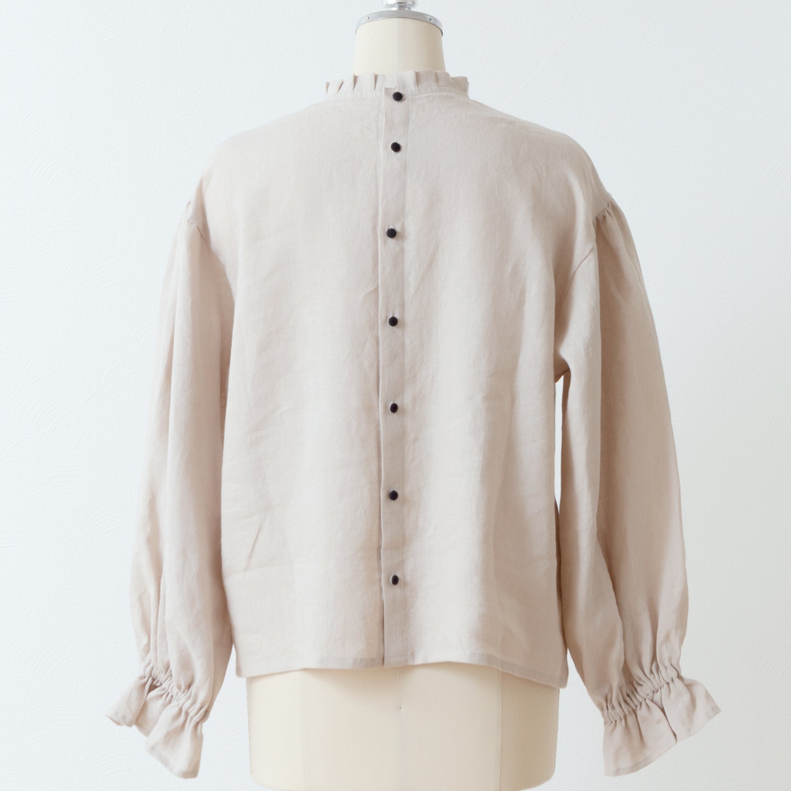 タックフリル衿が上品*春セレモニーにも*バックくるみ釦ギャザースリーブリネンブラウス/ベージュ